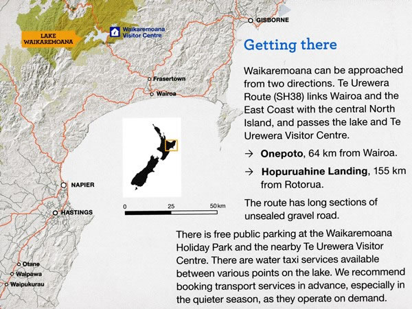 Lake Waikaremoana is in what used to be the Urewera National Park, which was (when it existed) the northern-most of all the national parks in New Zealand. This photograph of a diagram in a Department of Conservation leaflet shows where the lake is in relation to the rest of the country. In brief, it’s due west of Gisborne. On Sunday, 20 December 1987 – two days after Evan completed his last year at primary school – we drove northeast from Wellington through Waipukurau, Hastings, and Napier to Wairoa, where we turned left onto State Highway 38 and headed northwest to reach the lake. |