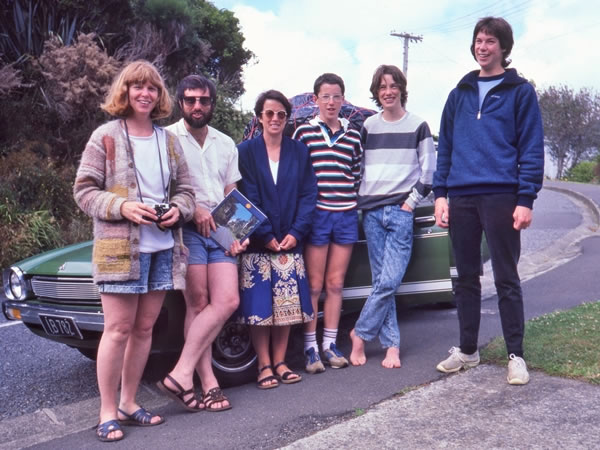 Neighbourhood friends of ours, the Hannahs, came with us on our 1987 trip to Lake Waikaremoana. Standing in front of the Hannahs’ car outside our house, ready to leave Wilton on Sunday morning, 20 December 1987, are – from left to right – Pauline and John Hannah, Heather and Evan Roberts, and Tim and Joss Hannah. |