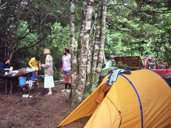The seven of us – the Hannah and the Roberts families – spent three nights at the Aniwaniwa campsite near what used to be the Urewera National Park headquarters and what is now the Waikaremoana Visitor Centre. From left to right in this photo are Joss Hannah, Heather Roberts, Pauline Hannah, and John Hannah (as well as the Hannahs’ green Mitsubishi and our red Ford Laser). |