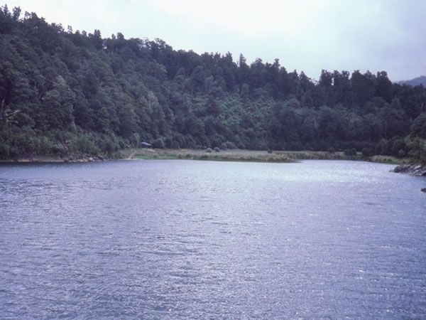 Before we reached it, our second night’s destination, the Marauiti Hut, could be seen across one of Lake Waikaremoana’s many small bays and inlets.