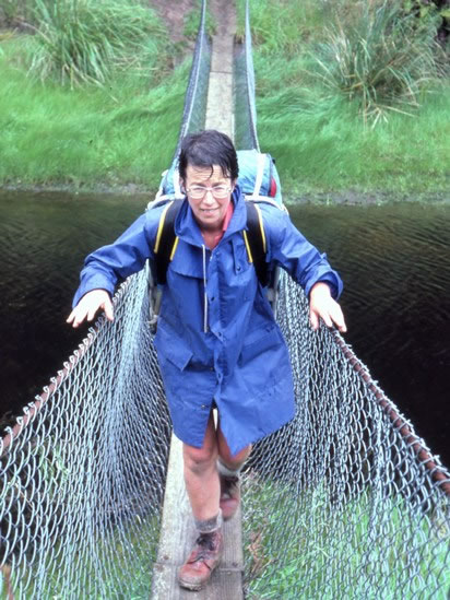 In order to get to the Marauiti Hut, we had to cross a small inlet on a swing bridge, and this time Heather decided to carry her pack when she crossed it.