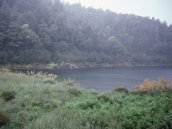Looking at Lake Waikaremoana and the thick virgin bush of Te Urewera from the porch of the Marauiti Hut.