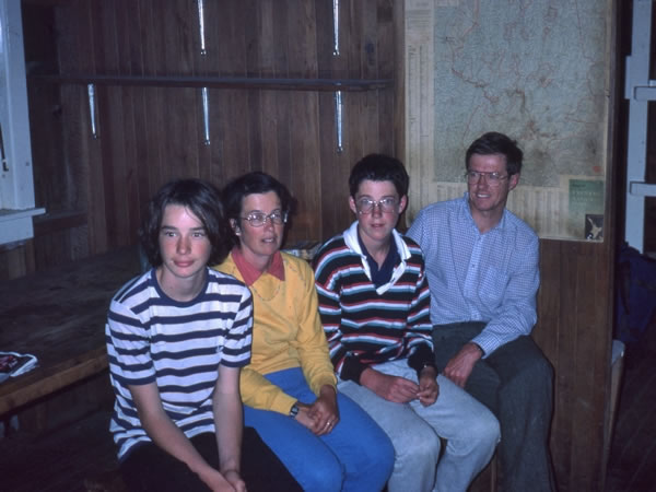 A photograph of the four of us in the Waiopaoa Hut on Christmas night 1987.