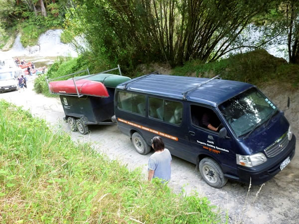Our guide, Jono Billington, then skilfully backed the van and trailer down an incline to the banks of a tributary of the Whanganui river.