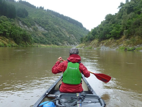 When the forested sides of the Whanganui started to include pine trees, we realised that we were, indeed, getting closer to “civilisation.” The final section of the river that we paddled wasn’t always as smooth as it is in this photograph (which was taken at 11:45 am), but – thanks to the increased flow as a result of the rain we’d had overnight – the “good rapids downstream” that we’d been warned about didn’t cause Heather and me major problems and we got through them – or, rather, over them – without having an unwanted swim. |