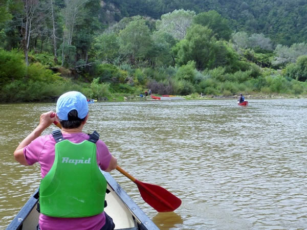 Heather paddling in towards the Pipiriki landing site. Jono is in front of us, near the right-hand edge of the photograph.
