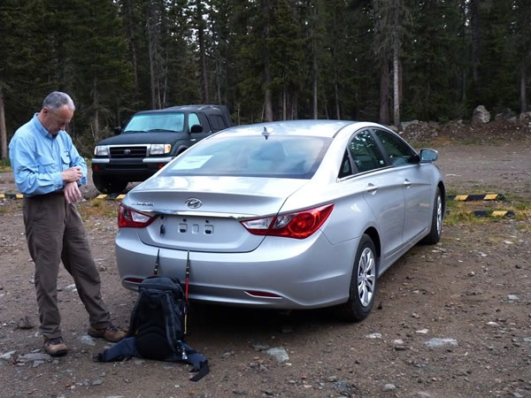 At the Taos Ski Valley's hikers' parking lot, Eric calibrated the altimeter on his watch to bring it into line with the correct height above sea-level of the starting point of our hike up Wheeler Peak – namely, 10, 200 feet / 3,109 metres.