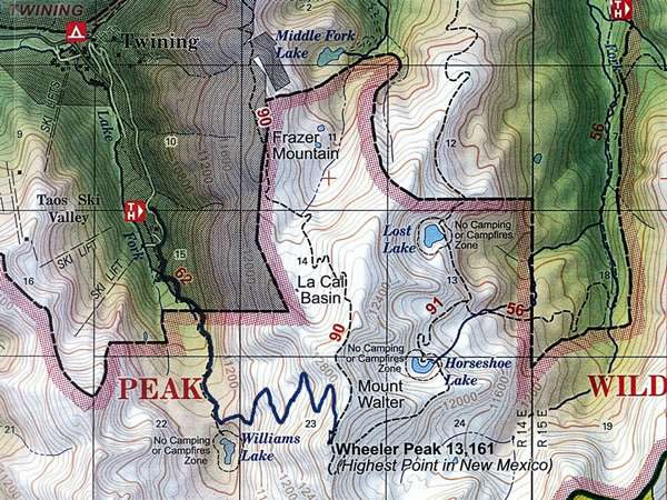 I’ve marked the route we took both up and down the mountain with a blue line on a portion of the US Forest Service’s map of the Wheeler Peak Wilderness.