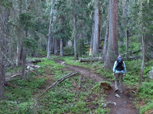 The track from Williams Lake to the summit of Wheeler Peak was given a major upgrade in 2011. It was formerly a very steep slog (described by Charlie and Diane Winger as “a well-defined but unmarked trail heading uphill … with sections of up to 60 degrees”); now it’s known as trail 67 in the Carson National Forest and consists of a well-benched series of zig-zags / switchbacks – including some very long ones – that gradually climb all the way to the peak’s summit ridge. Here is Eric zigging his way up one of the earlier switchbacks. |