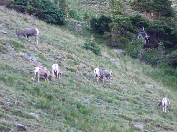 Soon afterwards we saw this flock of bighorn sheep grazing on the slopes of the mountain south of us. Because the wind was blowing from them and towards us, we hoped we might be able to get closer to them.