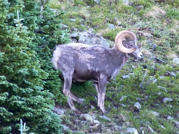 Seven minutes after first sighting the flock of bighorn sheep, we were near enough to see them in all their glory. The horns of fully grown males weigh about 30 lbs / 14 kg.