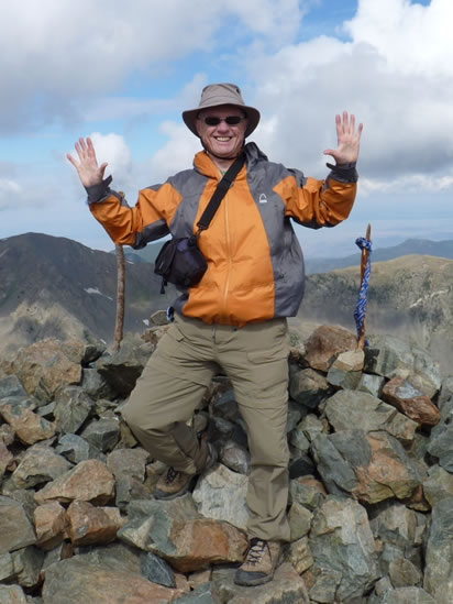 ... and Eric took this picture of me at the summit of Wheeler Peak – the tenth US state highpoint that I’d climbed. It was moderately windy and also fairly cold on top of the peak, which accounts for the fact that both Eric and I had put on an additional layer of clothes, which we wore for quite a way down the mountain as well. |