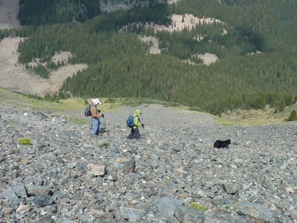 Looking down the scree field, Harry Martz, his daughter Angela and her dog, Shadow, were a short way ahead of us.