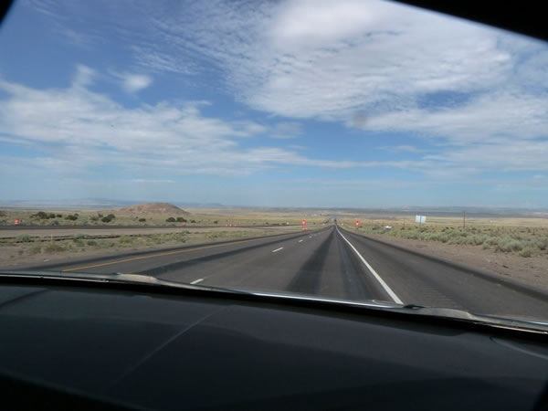 The next day – Monday, 9 August 2012 – we left Albuquerque and headed west along US interstate highway 40 on our way to Arizona. While I drove, Eric took this photo of the straight road and New Mexico’s semi-desert landscape. (This is the last picture in this album.) |