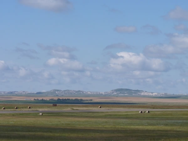We left Interstate Highway 94 seventeen miles / 27 kilometres west of Dickinson, and turned onto US highway 85. After travelling south for about 27 miles / 43 kilometres on US-85, we crested a small hill and were treated to this view of farmlands, the Stewart Lake National Wildlife Refuge (which is in the middle distance), and White Butte (on the horizon). |