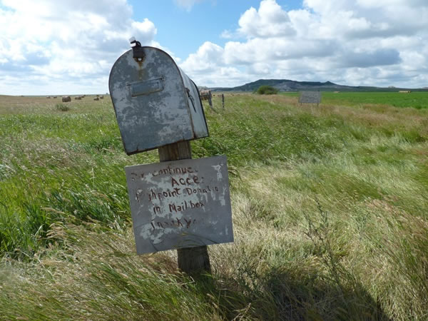 This mailbox is, in effect, the White Butte trailhead. The North Dakota highpoint is on private land, and the sign below the mailbox says (or, more accurately, probably used to say): “For continued access [to the] highpoint, donations in mailbox. Thank you.” The White Butte trailhead is approximately 3,100 feet / 945 metres above sea-level. |