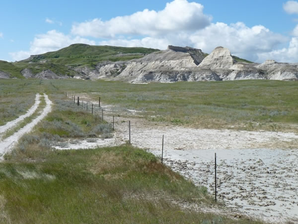 Once we’d passed the ruined cottage, the trail was primarily on white clay, which has been washed down from the bentonite clay fin and surrounding buttresses that can be seen on the right-hand side of this photograph.