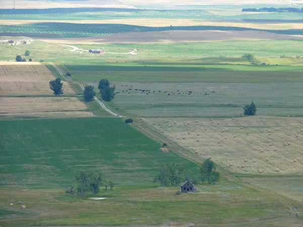 A telephoto shot looking back at the trailhead and John’s car (which is just visible near the centre of the picture at the start of the gravel road that heads down to and between the tall trees in the middle distance).