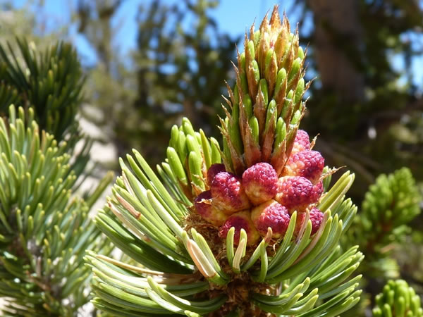 Bristlecone pines have needles that come in packets of five and small purple seed cones.