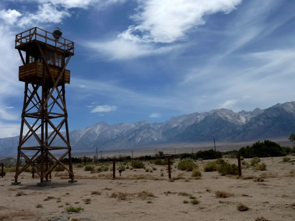 This watch-tower at Manzanar now looks out over only the former camp’s bleak desert landscape and the foothills of the Sierra Nevada mountains.