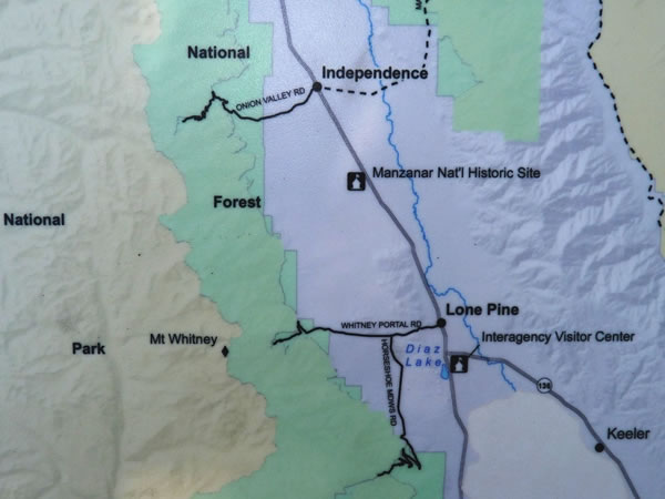 On 18 July, Eric and I drove south from Bishop, which had been our base for four nights, through Independence to Lone Pine, then up the Whitney Portal Road as a scoping exercise to see where we’d be heading the following morning, and finally back to Independence, where we’d reserved a room in a motel for two nights. |