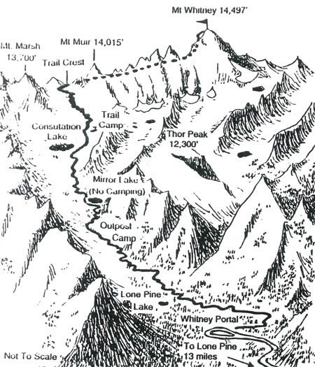 This diagram illustrating the Mt Whitney trail route was given to us at the Eastern Sierra Interagency Visitor Centre.