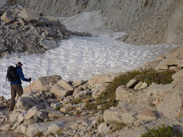 At about 6:25 am, I took this photo looking down onto Eric as he made his way up the slopes leading to the Mt Whitney trail’s wire-ropes (or cables) and switchbacks. A small snow-field can be seen below him.