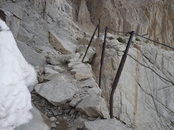 The cables are to protect climbers from falling down the steep granite bluffs on the right-hand side of the trail when it’s covered with ice (little of which was left when we were there).