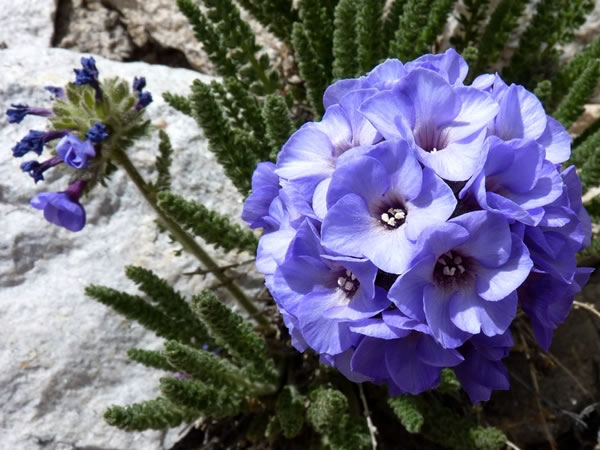 There was time to smell the flowers (as well as photograph them). These are sky pilots. They are particularly hardy: they were the only variety of flowers that we saw above the 13,000 foot / 3,962 metre mark on Mt Whitney.