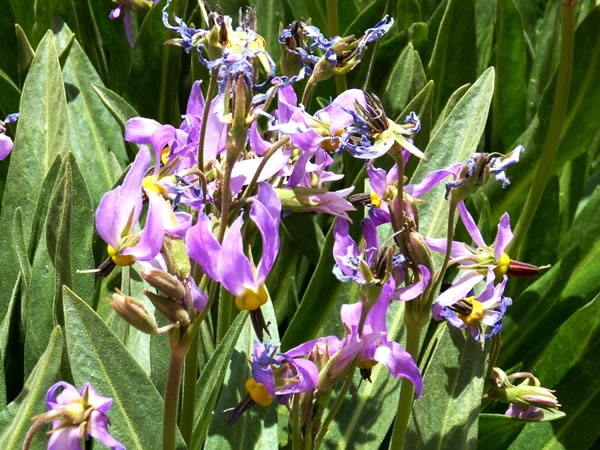When we were down at about 12,000 feet / 3,656 metres above sea-level, there were more flowers alongside the trail. These were near Trail Camp. I think they are Jeffrey’s shooting stars (