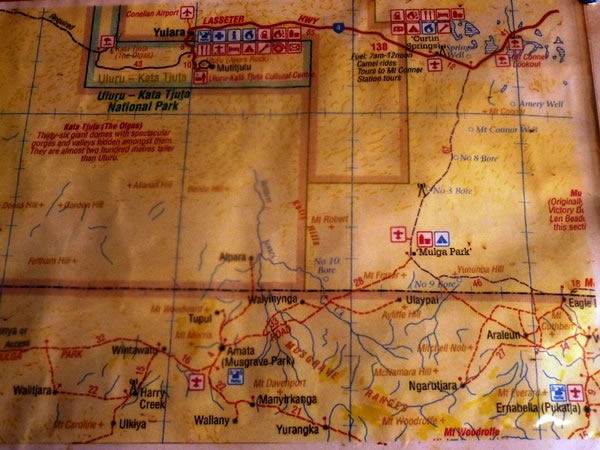 This is a photograph of a map in SEIT’s camp near the foot of Mt Woodroffe. It shows the route we took to get to the mountain. Initially, we drove east from Yulara (the Ayers Rock resort village) for 85 kilometres / 52 miles to Curtin Springs Cattle Station. After an additional 12 kilometres / 7.5 miles, we left the sealed road (i.e., we left the Lasseter Highway) and turned right – south – onto Mulga Park Road. After 67 kilometres / 41 miles, we stopped near the Mulga Park Station homestead for morning tea. A few kilometres later, we turned off Mulga Park Road, branching right onto a small track that took us to the South Australian border. We then continued making our way south on small bush roads to SEIT’s camp at Ngarutjara – the base for our Woodroffe climb. |
