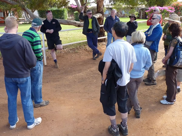 While we were at Curtin Springs, we gathered under the shade of a gum tree, and Brett Graham briefed us about where we’d be going and what we’d be doing. From left to right: Simon Bignold, John Bignold, Brett Graham (leaning against the white railings), David [surname unknown] and David London (both with their backs to the railings), Paul Ma, Ken Bell, Nicole, Eric Hodge and behind him Hudson Pratley, Grayson O’Connor (wearing the straw hat), and Sue. |