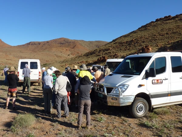 ... to the base of Mt Woodroffe to enable us both to have a look at the peak and to work out which routes up the mountain we wanted to climb. In this picture, people are consulting maps and discussing possible ways up the mountain. In addition, several people are wearing nets over their heads … |