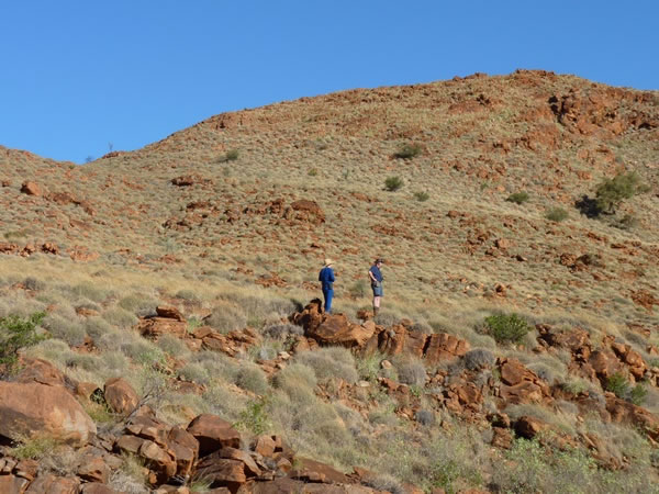 Some of us explored a dry creek bed as a possible route up the mountain, and – while doing so – Grayson O’Connor (left) and Chris Gamgee (a SEIT staffer) climbed part-way up the spinifex-covered hill on the eastern side of the river bed to survey the landscape from a higher vantage point. |