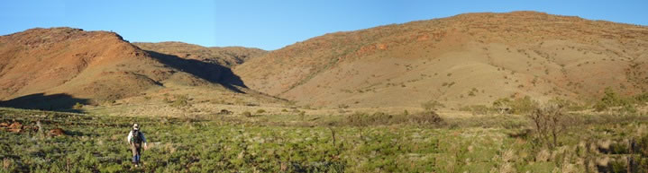 This three-shot panorama – taken half-an-hour after we started out from the base of the mountain – shows both what we did and why we did it. After climbing the hillside in the previous picture, Eric and I walked down onto and across the plateau that Eric’s on in this picture. It was largely spinifex-free, which was an added bonus. We then climbed two-thirds the way up the ridge that comes down from the left-hand skyline, until we reached a point below the first band of brown rocks, when we veered right into the valley that’s still in shade in this picture. We traversed west (i.e., heading right) along the side of the valley, slowly gaining height as we moved, until we reached the main bulk of Mt Woodroffe, which dominates the right-hand half of this picture. Once we were on Woodroffe itself, we simply aimed for the skyline, which led us to the summit. We chose this route in order to avoid both the thick fields of spinifex on Woodroffe’s lower slopes (which account for the grey-green sheen on the bottom half of the peak), as well as the rocky banks criss-crossing the upper half of the mountain. |
