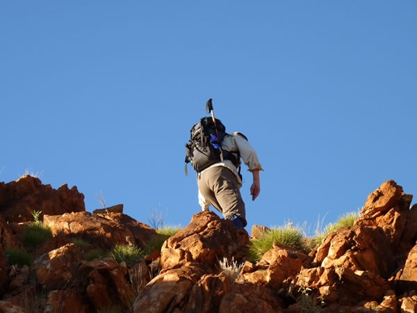 Eric cresting a small false summit on the ridge we were following. Note the new, young spinifex plants growing between the rocks. They were small enough to be avoided with ease.