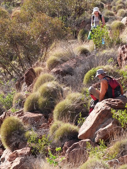 At 9:20 am – exactly two hours after we began the climb – Eric took this photograph of Jeni and me as we dropped down into the gully that separated the ridge we were traversing and the main massif of Mt Woodroffe.
