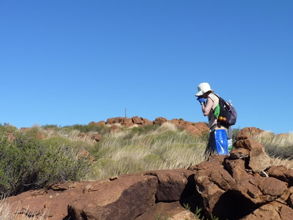 ... and two minutes later we could see the large summit cairn. Incidentally, Jeni is wearing gardening gloves in this picture. During the climb, almost everyone wore either gardening or leather gloves to protect themselves from the spinifex’s spikes. |