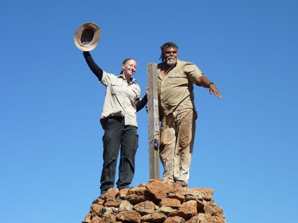 Page Dosen and Lee on top of Mt Woodroffe / Ngarutjaranya’s summit cairn. Lee – one of the custodians of the mountain – is standing appropriately proud and tall.