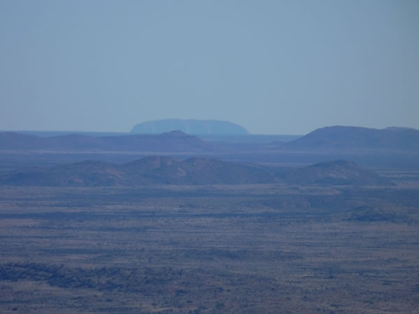 A telephoto picture from the summit of Mt Woodroffe looking north-west towards Uluru / Ayers Rock, which can be seen on the horizon. As the crow flies, Uluru is fully 130 kilometres / 81 miles away.