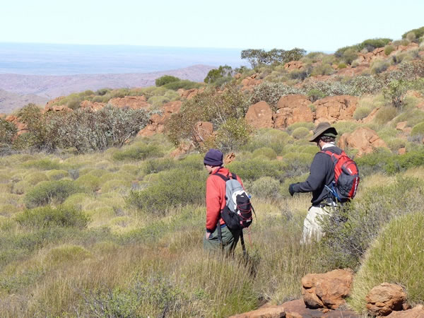 Hudson Pratley (left) and Ken Bell weaving their way through large clumps of spinifex.