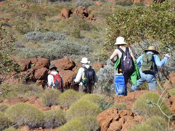 A conga line of spinfex dancers. From left to right, Ken Bell, Eric Hodge, Jeni Ward, and Peter McCrorey.