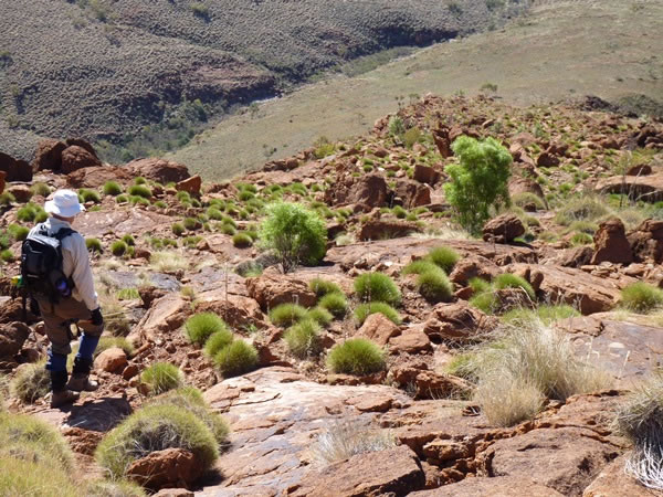 Eric starting to make his way down the ridge (which because of a fire, probably the previous year, contained only small new tufts of spinifex).