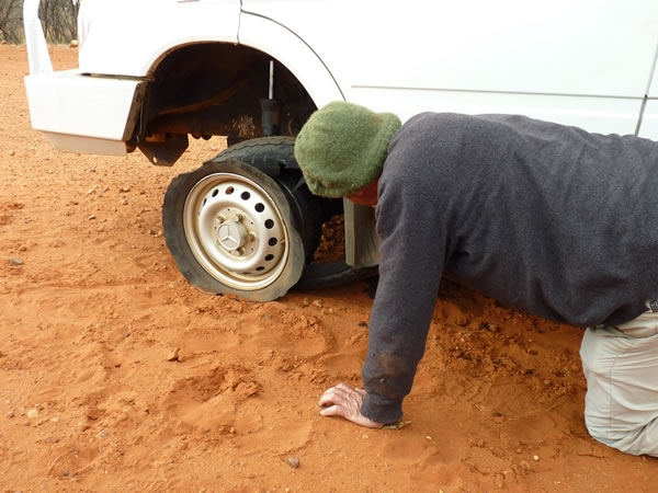 At about 11:45 am, Page Dosen radioed Brett Graham to let him know that her mini-bus had had a blow-out, so he turned round and went back to help change the bus’ tyre. In this photo, Ken Bell – an ever-practical grazier – inspects the damage and works out how best to jack up the bus. |