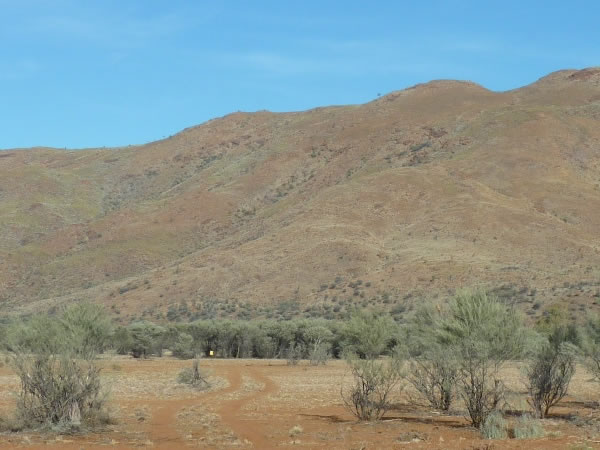 Ten minutes later, we arrived at a fork in the road (well, it’s really only a fork in a rough farm track). The fork is marked by a yellow tin can on a pole (which can be seen in the middle distance beside the tyre-tracks), and it’s near where most people who tackle Mt Zeil stop and look for a place to camp. It had taken us three-and-a-half hours to travel the 223 kilometres / 139 miles from Alice Springs. We’d read of someone covering the distance in two-and-a-half hours: Eric and I both felt it would have been suicidal to have travelled so fast on the roads we’d just been on. |