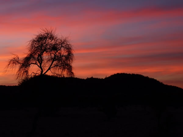Looking north at 6:15 pm at bands of pink cloud behind a scraggly she-oak and nearby hills.