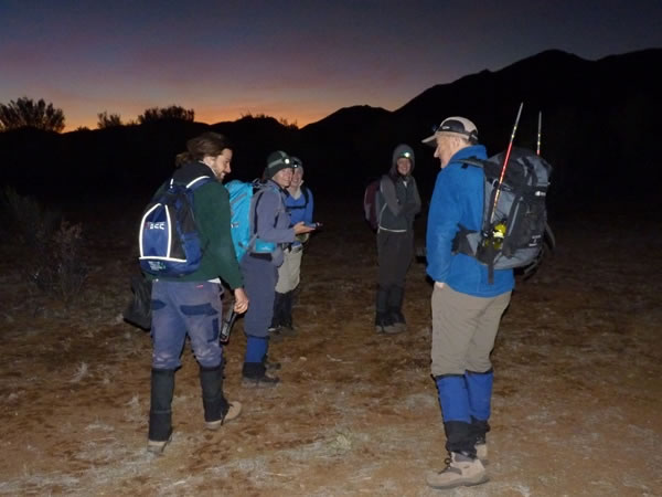 A couple of minutes later, we met up with a team of four La Trobe University zoologists whose campsite was a few minutes’ walk away from ours. Led by Dr Heloise Gibb, a senior lecturer at La Trobe (second from the left, with the light-blue rucksack), the team also included research assistant Manoli Photakis (on the left) and two recent Honours graduates, Rachael Wood (next to Heloise Gibb) and Katie McClaren (next to Eric). They were going to collect invertebrate samples from traps they laid on the mountain, and Eric and I had arranged to accompany them most of the way to the top. |