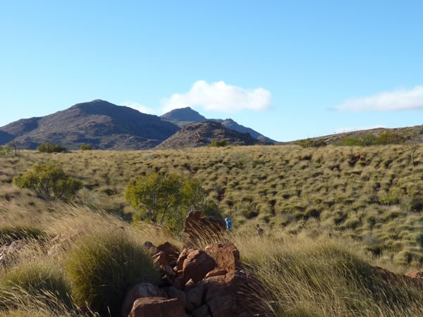 Around half-past-eight (after we’d been going for an hour and fifty minutes), we caught our first glimpse of the summit of Mt Zeil – it’s the peak in the far distance near the centre of the photograph. We were still going through some reasonably thick spinifex, but fifteen minutes or so later … |