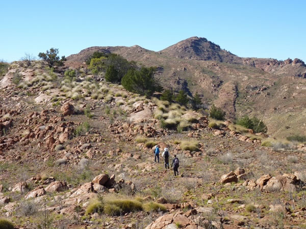 At 10:15 am on a perfect day, Heloise, Eric, and Katie make their way up one of the many small peaks that form the backbone of Mt Zeil. The summit of the mountain is clearly visible as the highest point on the distant horizon, but – as can be seen from this photo – we see still had quite a few ups and downs to go to get to it. |