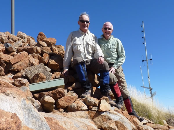 The summit of Mt Zeil is 1,531 metres / 5,023 feet above sea-level. The mountain is only the sixth highest of Australia’s eight state and territory highpoints, but as a peak Mt Zeil is noteworthy for the fact that it’s the highest mountain in Australia west of the Great Dividing Range. In addition, along with Queensland’s Mt Bartle Frere, Mt Zeil is also one of the toughest of the Australian state and territory highpoints to climb. The green tin to the left of Eric and me contains the mountain’s summit register. |